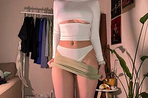 A teasing MILF stepmom in a mini skirt masturbates in her panties at home