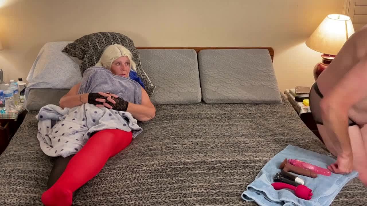 Granny dressed as harley quinn sucks cock in close-up pov