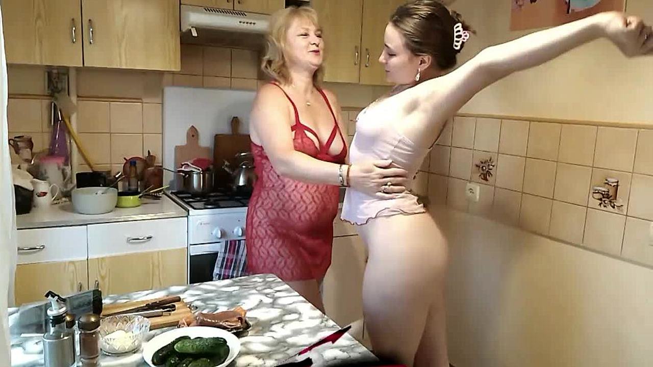 My bisexual milf and cute teen lesbian kiss naked in kitchen fingering tight pussies