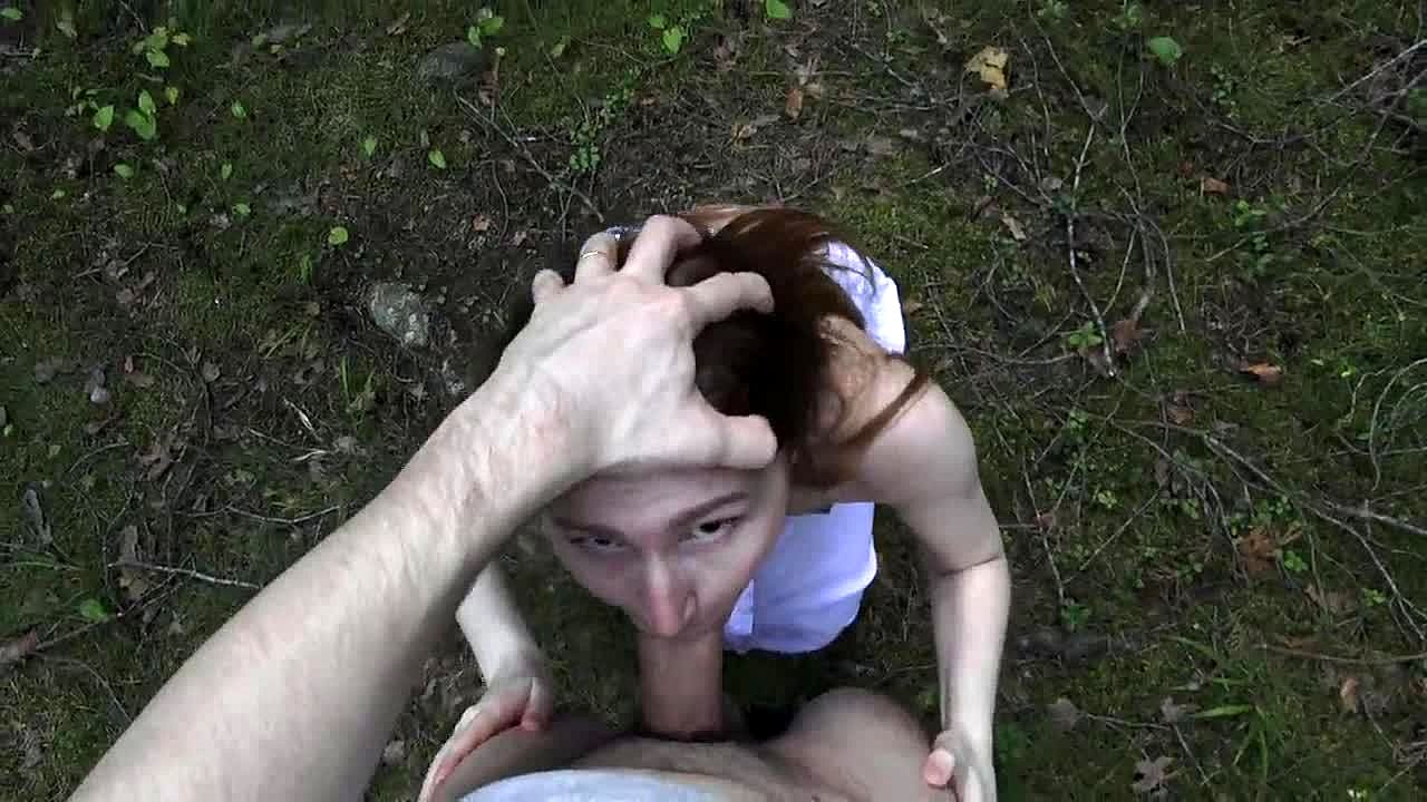 Random redhead teen deepthroats outdoor public cock swallow in forest